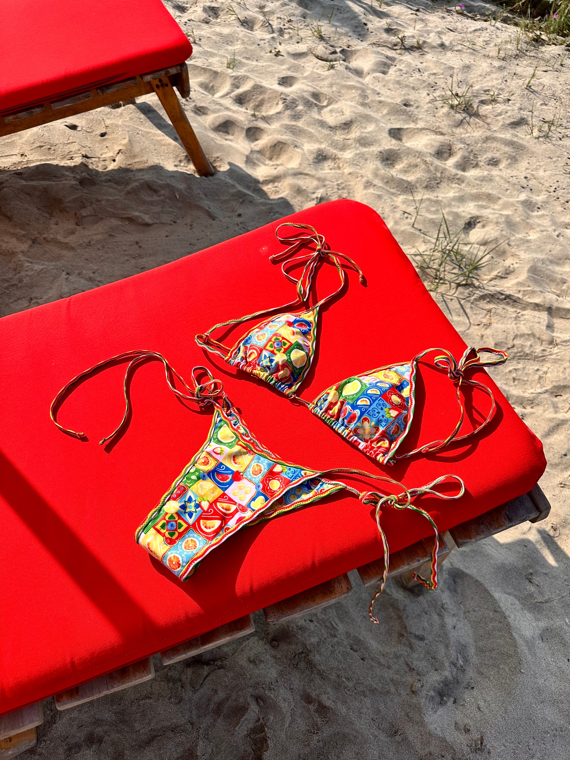 RIO - Haut triangle de maillot de bain deux pièces à motif multicolore. Haut ajustable dans le dos et dans le cou. Motif réalisé par un designer Français. Personnalisez votre bikini avec nos bijoux pour maillots !